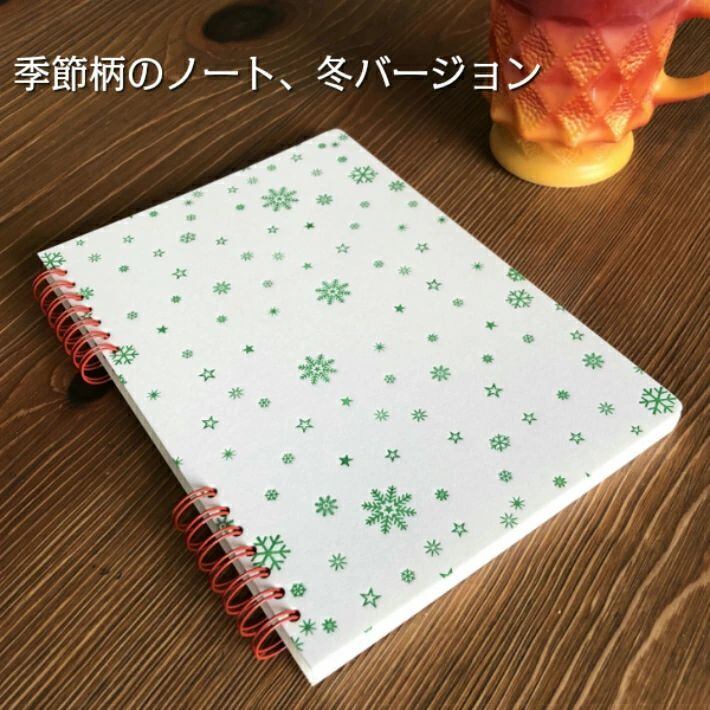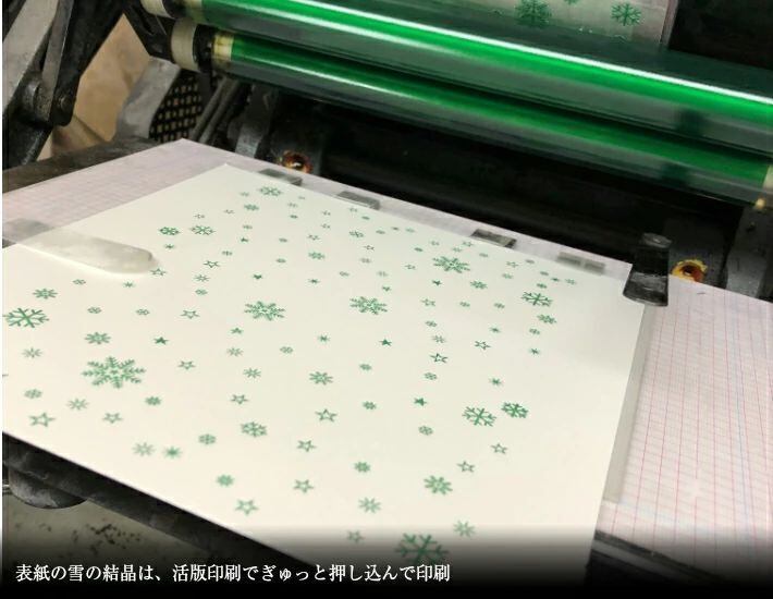 このノートは、冬らしいデザインが特徴です。表紙には温かみのある冬の風景活版で印刷しております。雪の結晶を緑,リングを赤,地は白にしてクリスマスカラーになっております。中紙は無地なので、思い浮かんだアイデアや出来事を自由に書き込むことができます。本文紙にはフールス紙を使用して、書き心地もよいものになっております。。日常のメモから、冬の特別な出来事まで、幅広く活用できるアイテムです。この時期のプレゼントにもよし、自分使いにもよし、ぜひ使って、楽しんで頂きたいと思います。