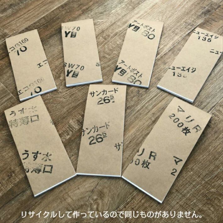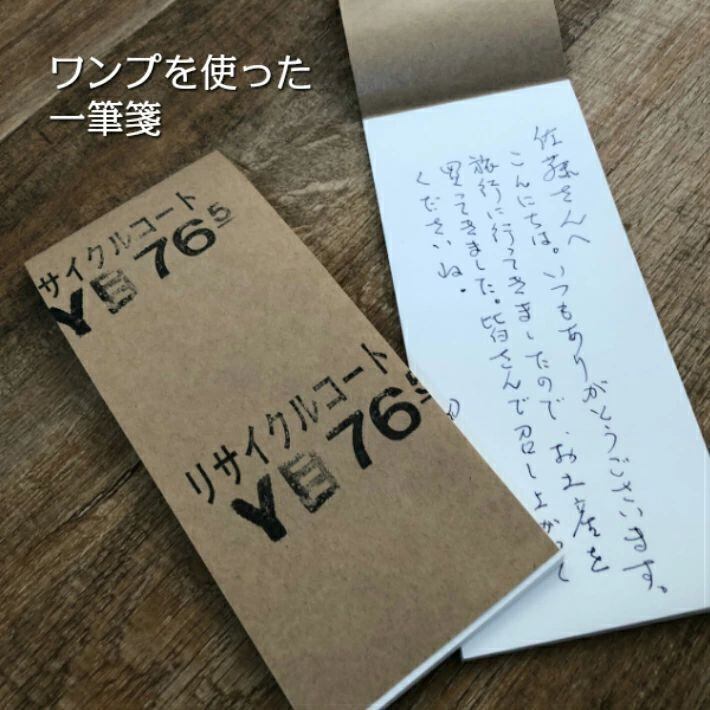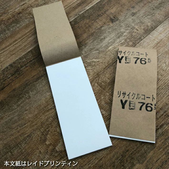印刷・製本屋である私達の会社では、紙が山積みになっている光景が日常です。この紙を梱包しているのが「ワンプ」と言う紙です。裏面にビニール加工がしてあり、湿気に強いのです。このワンプをリサイクルして一筆箋に仕立ててみました。