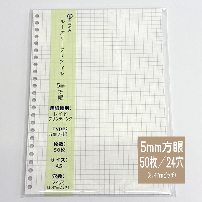 5㎜方眼が印刷されたレイドプリンティング紙(縞模様(レイド模様)が入った)を使用したルーズリーフリフィルです。図を描いたりとアイデアを整理したいときにはこの方眼が良い助けをしてくれます。専用のルーズリーフノートに差し込むことで、必要なページを追加したり、自由にカスタマイズすることが可能ですA5/24穴用リフィルです。