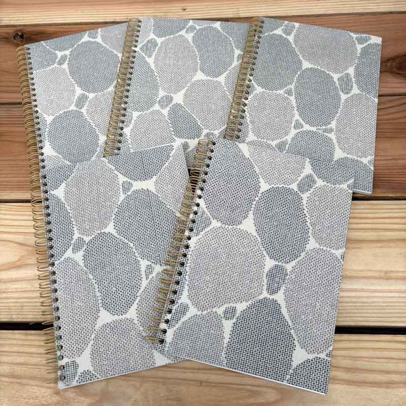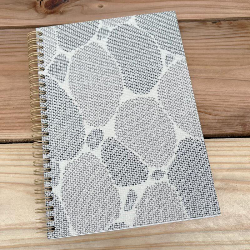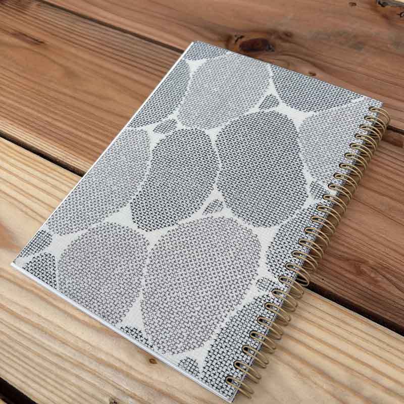 リユースされた着物を表紙に採用し、優雅な白鼠色の小紋が目を引く一冊です。それぞれ異なる柄で、一つとして同じものはない特別な出会いを楽しんでいただけます。